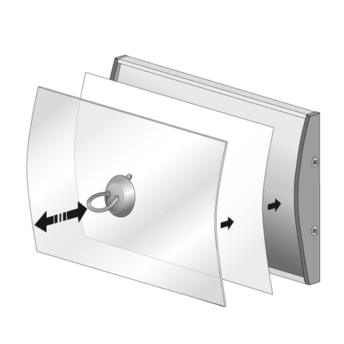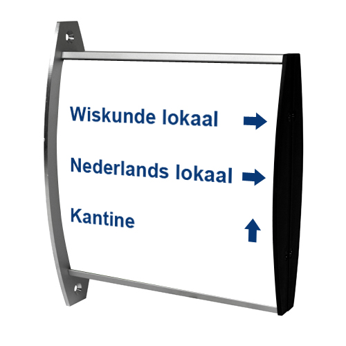 De indoorsigning is een haaks wandmodel en verkrijgbaar in 7 diverse (DIN) afmetingen. De materialen voor de inserts kunnen zijn, papier, acryl of pvc.